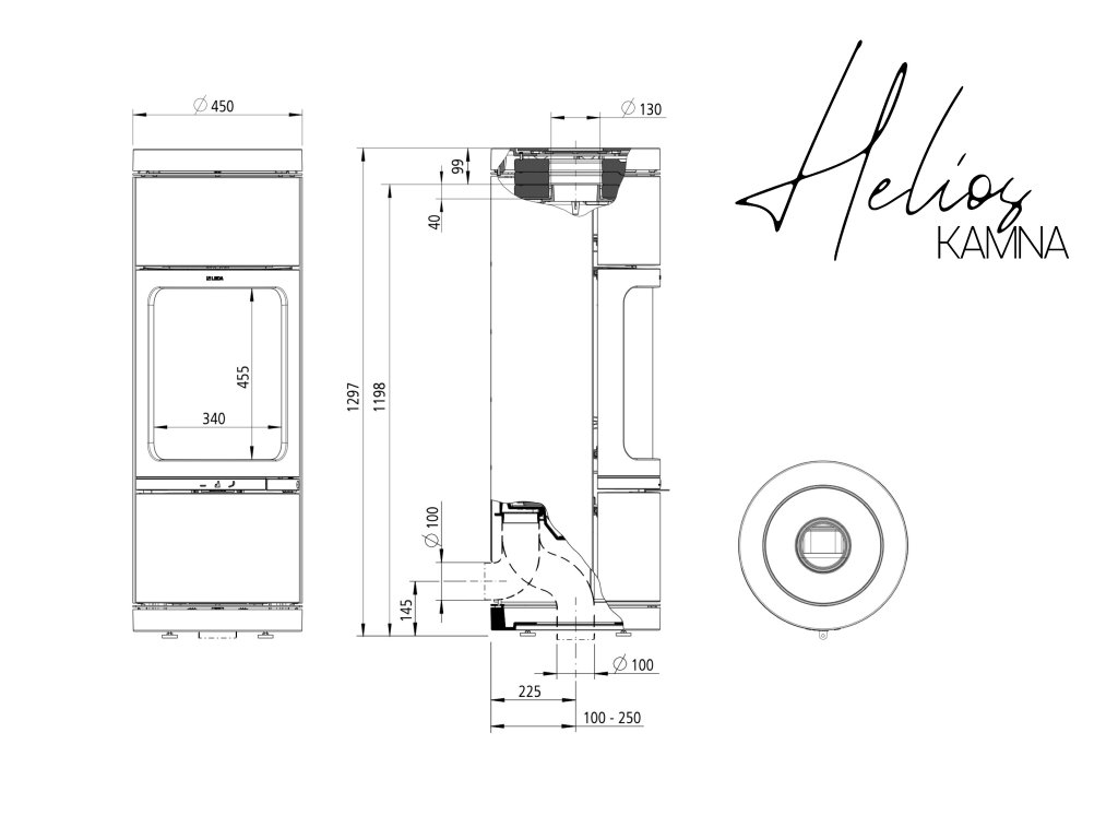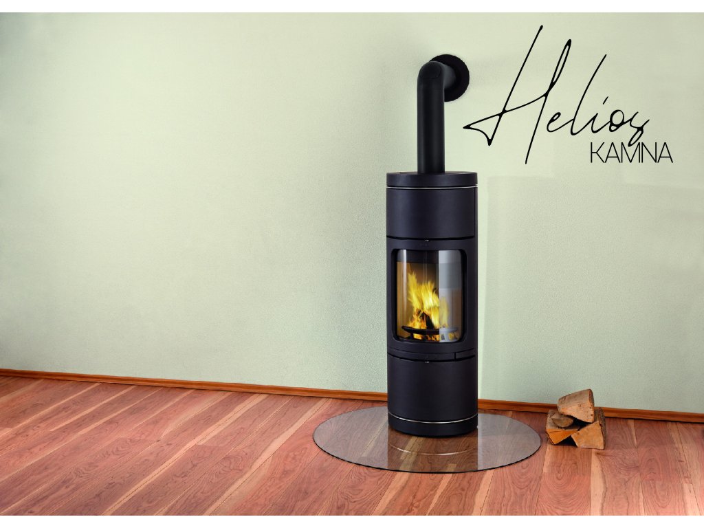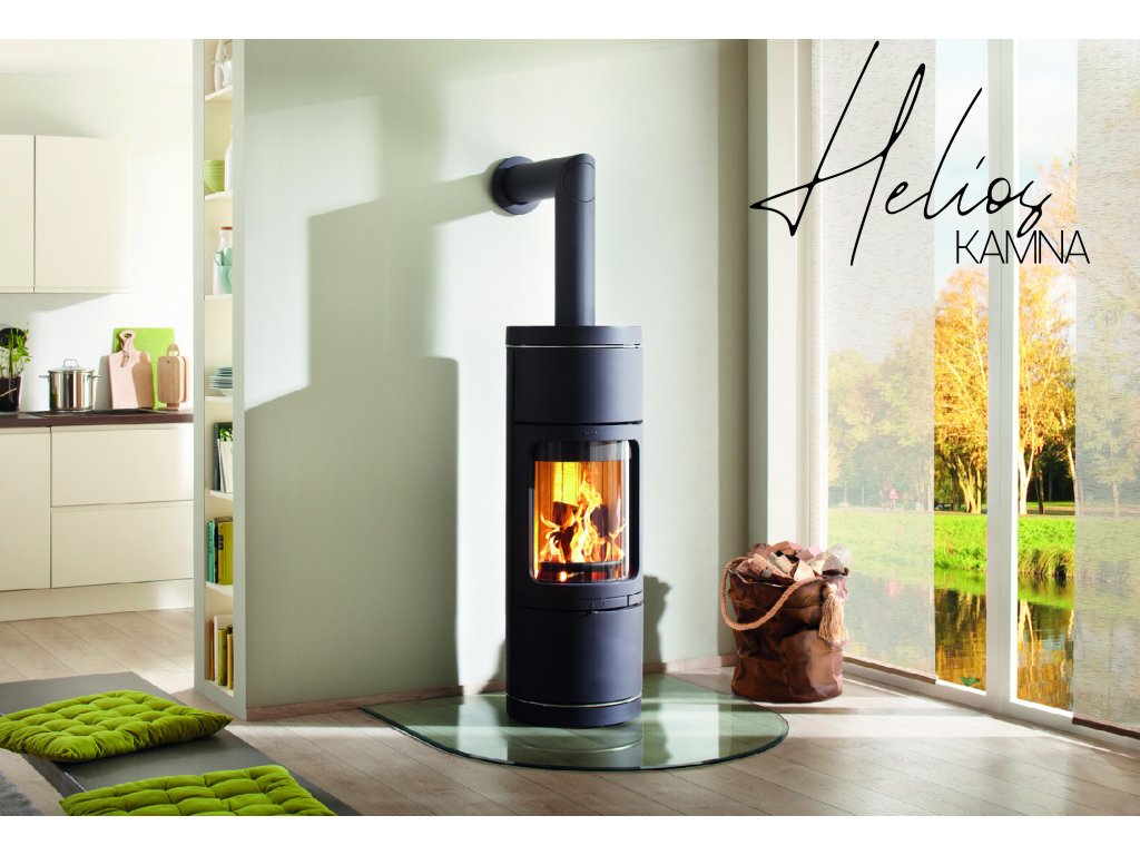 NOVIA C - litinová krbová kamna. Elegantní válcový design, obloukové sklo a horní připojení. Výška tohoto modelu 105 cm.