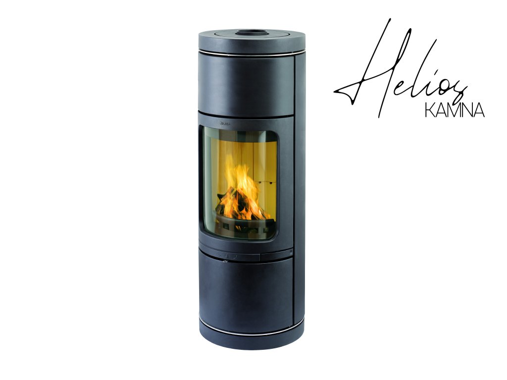 Kompaktní celolitinová kamna s volitelnou litinovou akumulací (+90 kg), v moderním válcovém tvaru s žádaným drážkovaným designem čelních panelů.